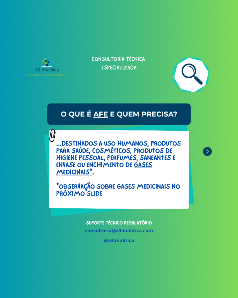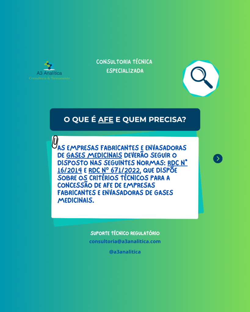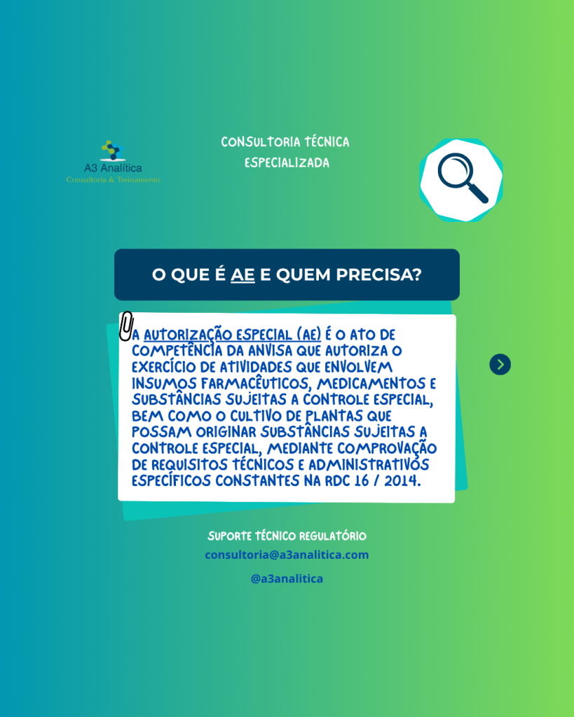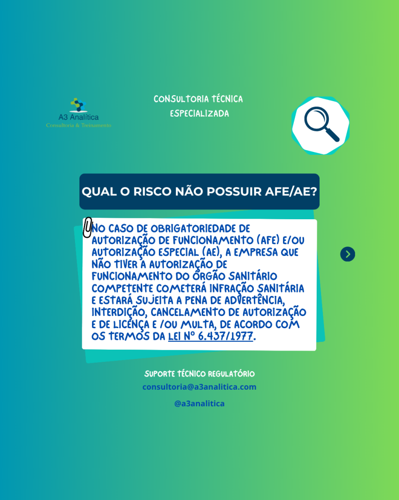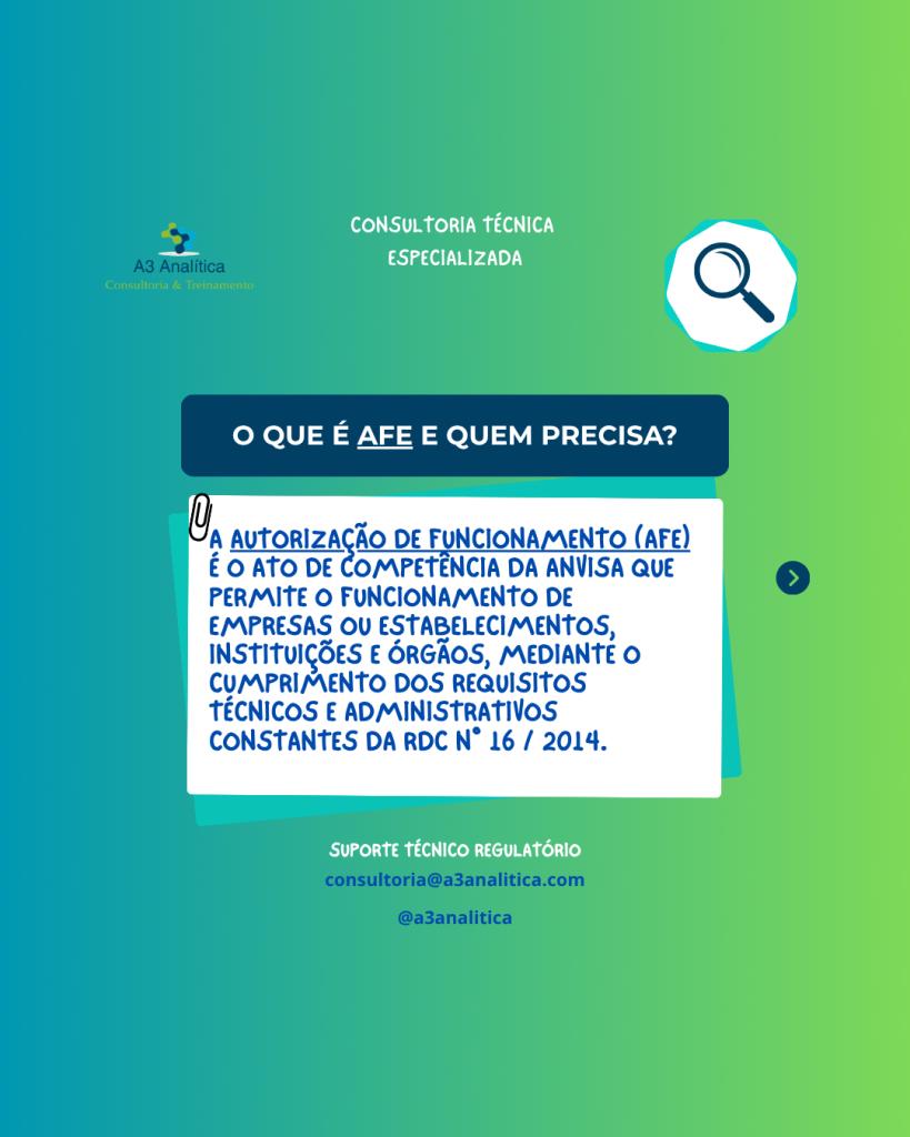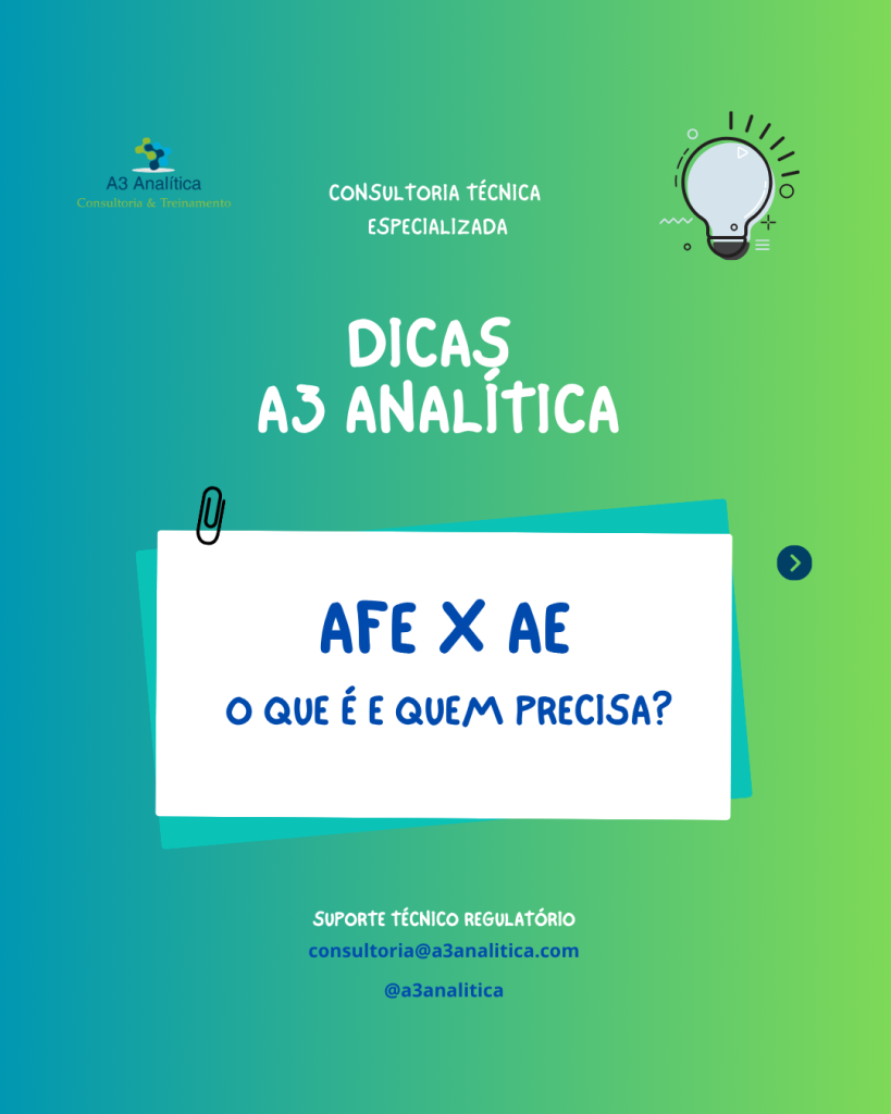 AFE e AE A Autorização de Funcionamento (AFE) e a Autorização Especial (AE) são uns dos requisitos mais fundamentais para empresas reguladas pela Anvisa. Arraste o post para o lado para saber melhor o que é e quem precisa de AFE/AE, e qual o risco de não possuir essas autorizações. A A3 Analítica – Consultoria […]