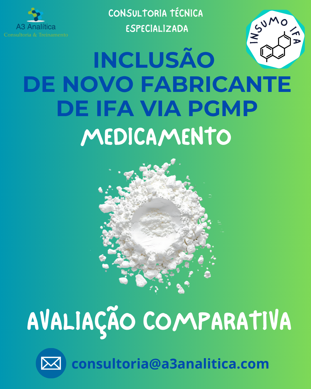 ✉️ Converse com nossos especialistas e assegure o sucesso do seu PGMP para inclusão de novo fabricante de IFA: consultoria@a3analitica.com